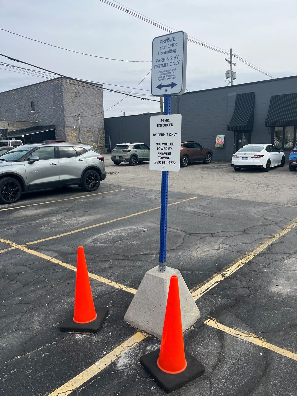 Park in any of the coned-off parking spaces labeled XCELOC Parking Only or in that row first.